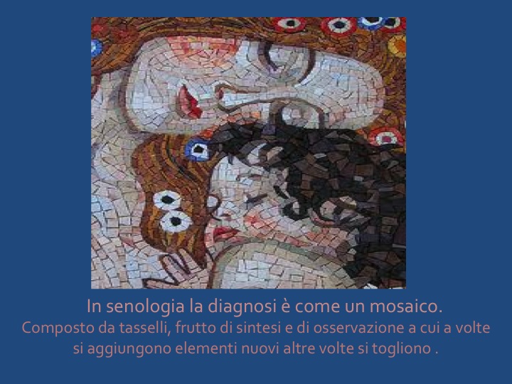Pensiamo che l’approccio metodologico all’analisi delle immagini in senologia diagnostica debba essere considerato alla stregua di un mosaico al quale aggiungere e unire tasselli, frutto di sintesi e osservazione, elementi diversi e spesso non omogenei, che contribuiscono ad avere un quadro sempre più preciso della struttura mammaria che esaminiamo, per ottenere tecniche di imaging più sensibili e più specifiche per la diagnosi precoce, perché anche la tomosintesi mammaria (mammografia 3D), pur essendo una ” mammografia migliore” da sola non basta.